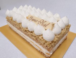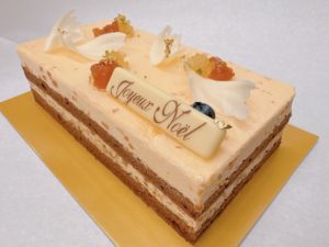 【パセ 】 21年間貯蔵された日本酒『琥珀の時空』のほのかな酸味とコク深い味わいのバタークリームに杏を添えて、くるみの味わい深いバタークリームにカルダモン香るショコラの生地と共に *小(10cm×8cm) ¥3,700 *大(16cm×8cm) ¥5,800
